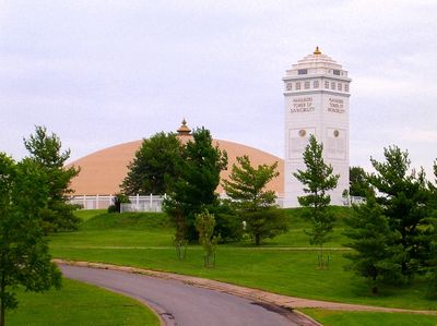 Two geodesic structures with golden roofs cover an area of 25,000 square feet each and rise 35 feet above the Maharishi International University campus.