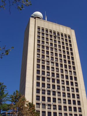 The building contains research laboratories, classrooms, and meteorological instruments on its rooftop for weather radar and atmospheric measurements.