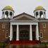 The church features two prominent domed towers, flanking one-story wings, and a pedimented porch supported by stuccoed Doric order columns.