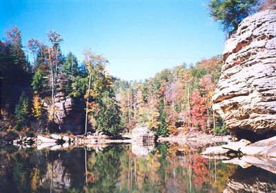 Grayson Lake State Park encompasses 1,500 acres of water surface, surrounded by forested hills and natural rock formations along the shoreline.