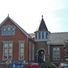 The Hamburg Public Library features a 1.5-story brick structure with an L-shaped layout, an octagonal rotunda, and a square portico entrance topped by a turret.