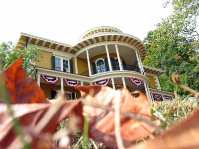 The Hillforest mansion stands on a high position along the Ohio River, featuring curved porches, circular windows, and a central belvedere at its summit point.