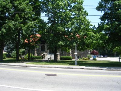 The Hills Memorial Library features a two-story stone structure with traditional New England architectural elements and contains 2,500 square feet of space.