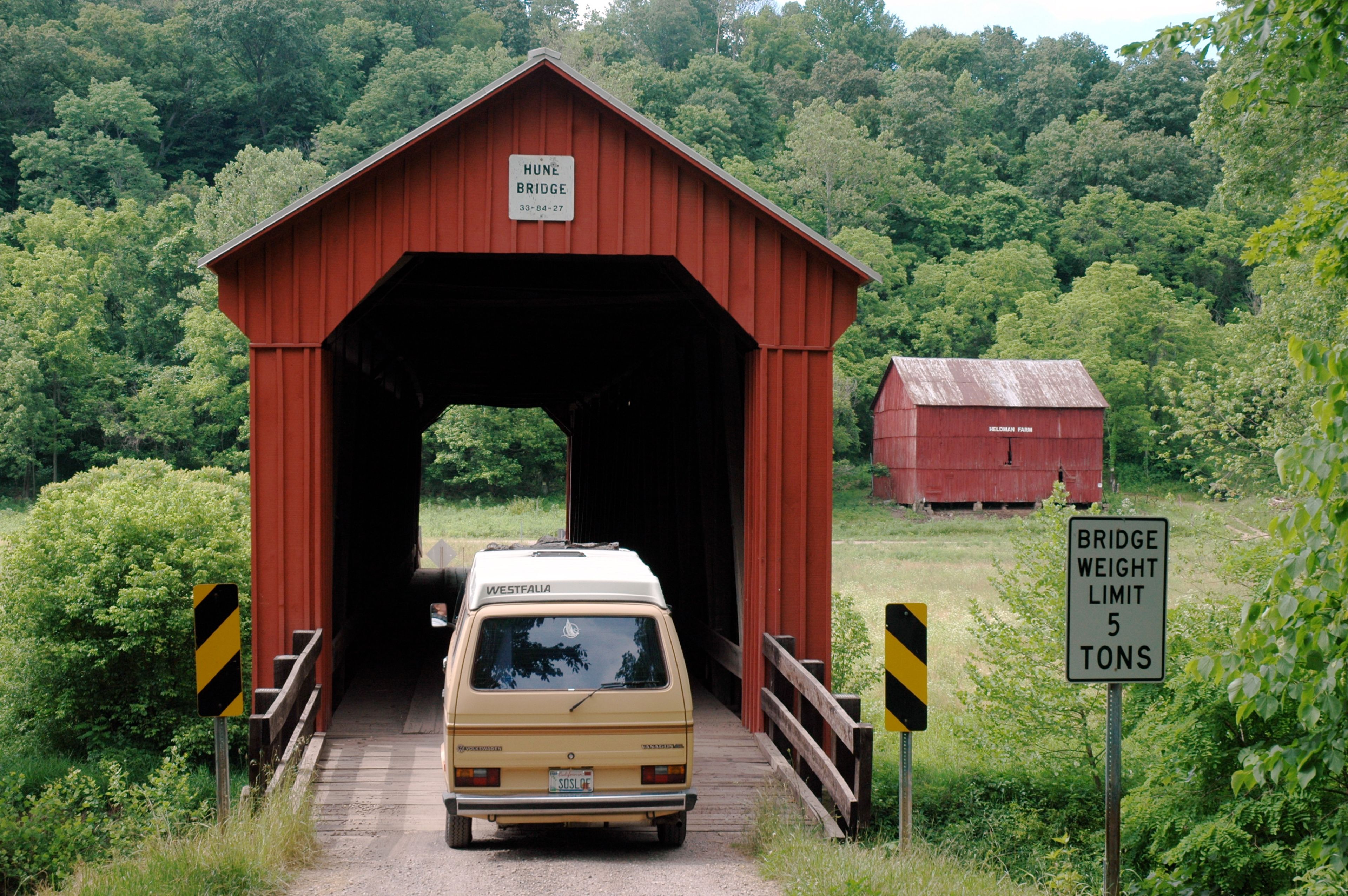 Local bridge builder Rollin Meredith constructed the Hune Covered Bridge in 1879, implementing the Long-truss style design that exemplified engineering methods of that period.