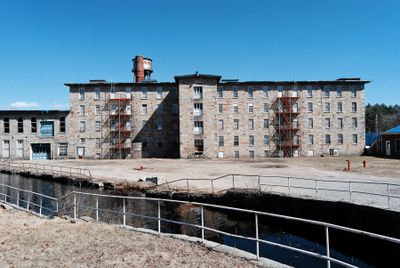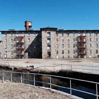 The 1844 stone mill building and worker houses illustrate the development of industrial communities in 19th-century New England textile manufacturing.
