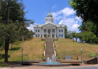 The Jackson County Courthouse stands prominently on a hill at the end of Main Street, with 107 steps leading to its Classical Revival entrance.