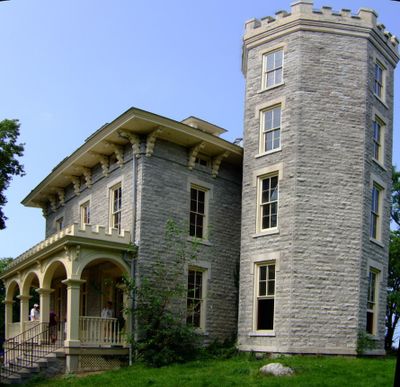 The Jay Cooke House is a stone residence on Gibraltar Island in Put-in-Bay, featuring a four-story octagonal tower with a crenellated parapet and rounded-arch openings. The structure combines Gothic Revival elements with solid stone construction and commands attention with its distinctive shape on the island landscape.
