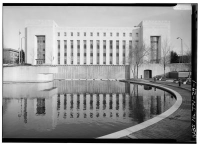 The five-story federal building features white marble cladding, geometric patterns, and projecting entrance pavilions adorned with carved eagles reflecting Art Deco architecture.