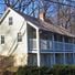 The wooden frame structure stands at a crossroads with clapboard siding, stone foundation, side-gabled roof, and second-story balustrade veranda.