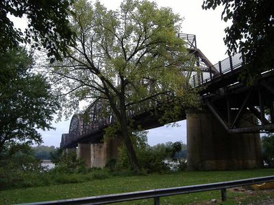 The Kentucky and Indiana Terminal Bridge spans the Ohio River between Louisville, Kentucky and New Albany, Indiana, featuring two automobile lanes alongside railroad tracks.