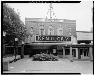 The Kentucky Theater features a decorative white stone facade with intricate architectural details and symmetrical window arrangements on South Fourth Street.
