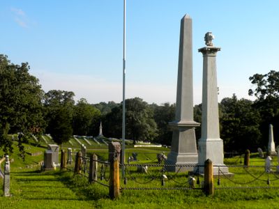 A granite obelisk topped with a Union soldier statue stands as the Unknown Soldiers Monument, constructed in 1912 to honor 48 unidentified military members.