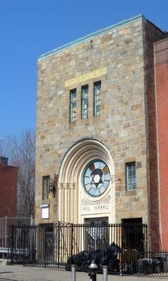 The Kol Israel Synagogue building features two stories of rectangular structure with fieldstone walls designed by architect Tobias Goldstone in Brooklyn.