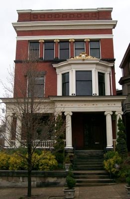 The L. S. Good House features a three-story brick structure with fluted wooden columns on sandstone foundations and an Ionic order colonnade on the third story.