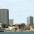 Lafayette Park encompasses 78 acres of urban space with glass-walled residential buildings, open green areas, and pedestrian-focused design elements in Detroit's east side.