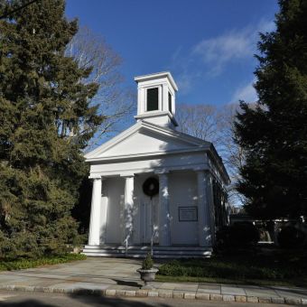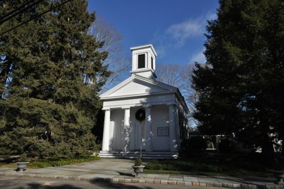 The buildings in Long Ridge Village display architectural styles from Colonial, Federal, and Greek Revival periods, with the Long Ridge Congregational Church featuring four unfluted columns.