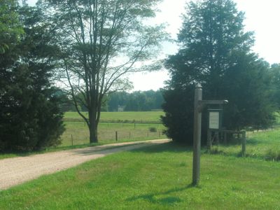 The three-bay frame house presents two stories with balanced proportions and extends across a site with views toward Port Tobacco Valley.