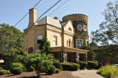 The 1886 Lord's Castle features a prominent three-story circular tower with corbelling and crenellations at 211 Hammond Street in Waltham.