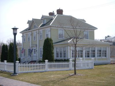 The yellow-framed Longfellow House stands as a two-thirds scale replica of Henry Wadsworth Longfellow's Cambridge residence, featuring porches at each end.