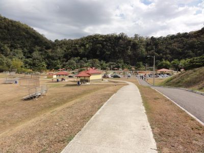 The park extends over 200 acres of land near Lake Cerrillos Dam, featuring mountain views and dense tropical vegetation throughout the grounds point.