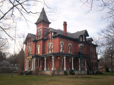 The two-and-a-half-story brick structure features a sandstone foundation, tall windows, a wraparound porch, and a central tower beneath a slate roof.