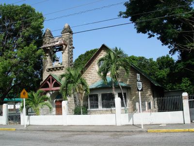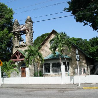 McCabe Memorial Church features concrete walls and a wood shingle roof design, standing prominently on Hostos Avenue in the Playa district of Ponce.