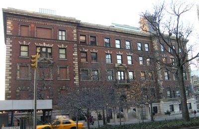 These interconnected structures feature four stories built with dark red brick, white limestone details, and terra cotta decorative elements on a raised basement.