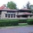 The Meyer May House is a home in the Heritage Hill Historic District in Grand Rapids designed by Frank Lloyd Wright. Its exterior shows long horizontal lines, light brick walls, and large art glass windows that create a quiet connection with the surrounding landscape.