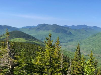 From the summit, hikers observe both the Saco River valley and Sawyer River valley, while Bartlett Haystack mountain frames the eastern perspective.