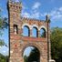 The fifty-foot-high limestone memorial features three Roman arches, a square crenellated tower, and terra cotta horse heads at the summit.