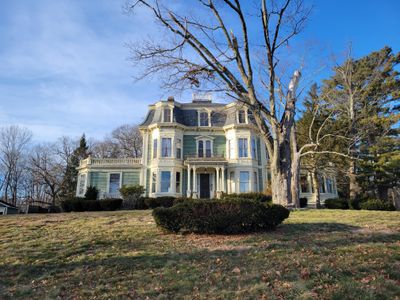 The Oak View building stands as a residential structure with Second Empire architecture, featuring characteristic mansard roofs and ornate exterior decorations from 1873.