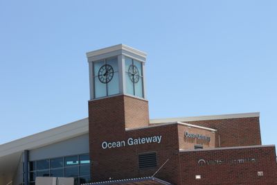 The Ocean Gateway Terminal extends over water with a two-story structure connected to a receiving building through pedestrian ramps spanning 300 feet.