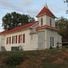 The T-shaped wooden building features weatherboard siding, Gothic Revival lancet windows, and a bell tower topped with a tin fleur-de-lis ornament.