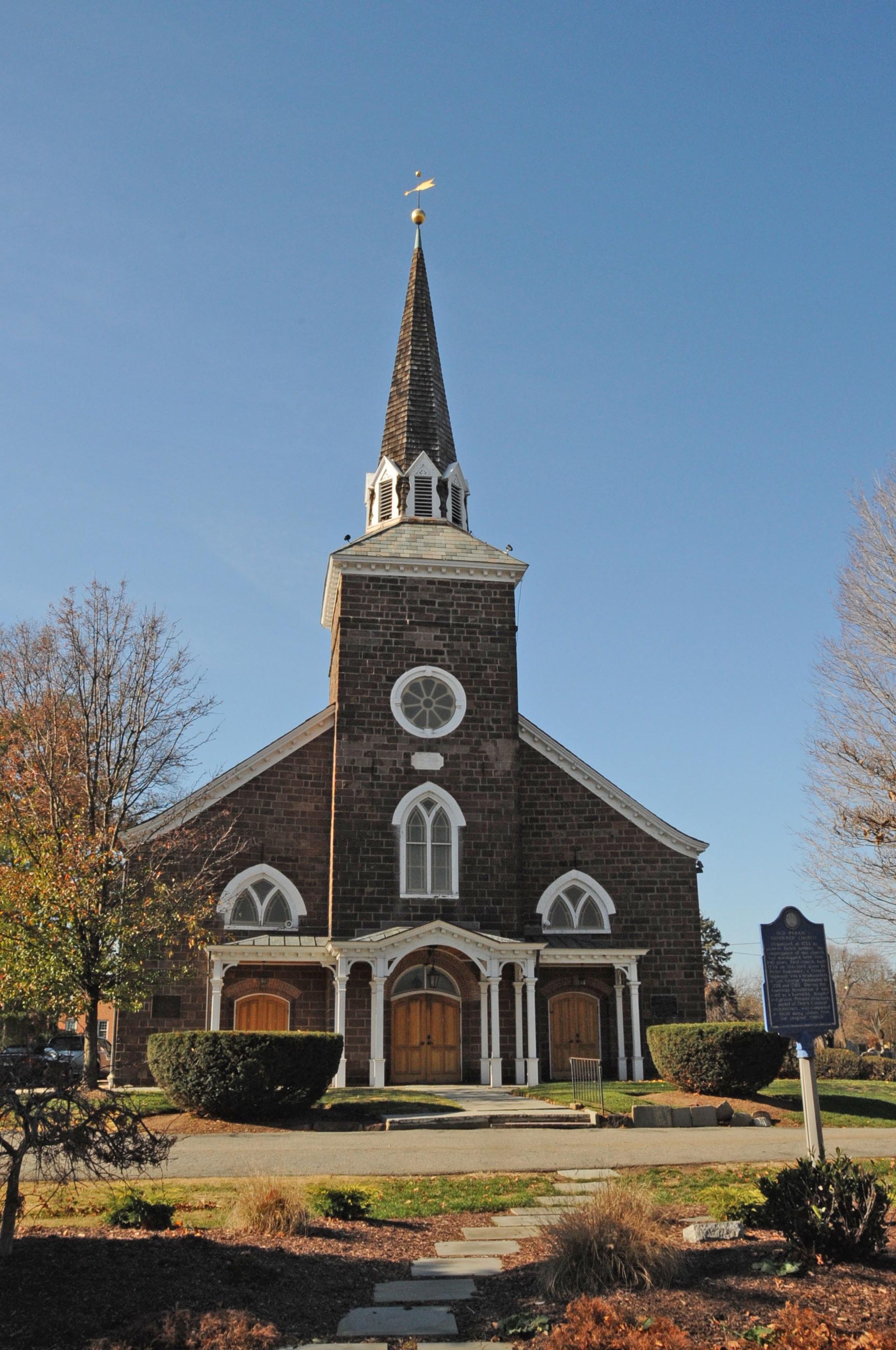 The stone church structure, constructed in 1800, served as a military post, hospital, and prison during the Revolutionary War, with General George Washington establishing headquarters there.