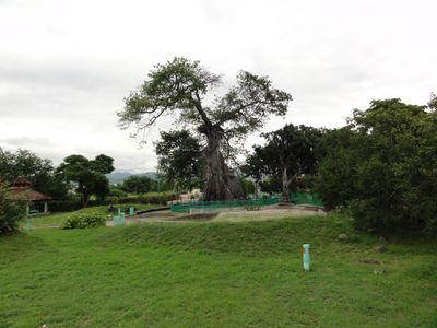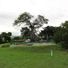 The park features winding paths surrounding a centuries-old ceiba tree, with benches distributed throughout the green landscaped grounds near Rio Portugues.