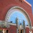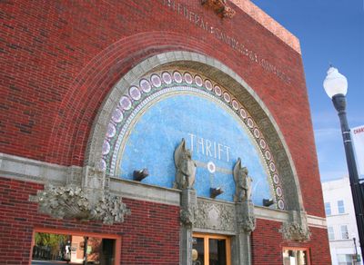 The north facade entrance displays nature-inspired terra-cotta decorations, glass mosaics, and intricate foliage patterns created by decorator Louis Millet and modeler Kristian Schneider.