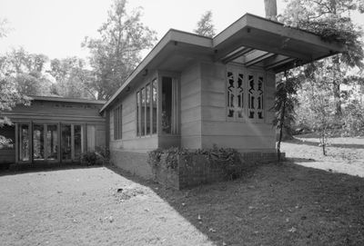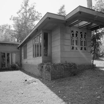 Pope-Leighey House is a single-family residence with early 20th-century modern design, distinguished by horizontal lines, cantilevered roofs, and expansive windows. The compact layout integrates living, dining, and kitchen areas in open flow, while natural materials such as wood and stone define the interior design.
