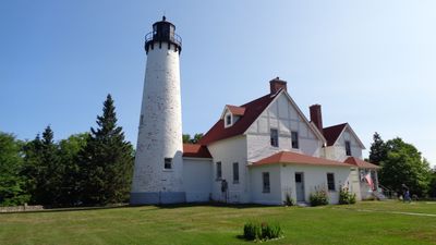 Visitors can climb 72 steps to reach the tower observation deck, offering views of Lake Superior and passing freighters navigating through Whitefish Bay.