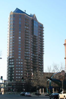The Plaza Building rises among other modern structures in downtown Des Moines, contributing to the central business district's architectural variety.