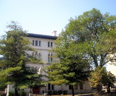 The Pink Palace features distinctive pink-colored walls and architectural elements from the early twentieth century, standing prominently on 16th Street Northwest.