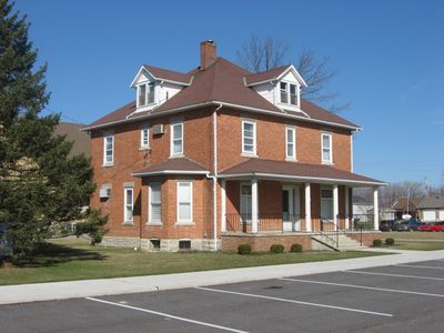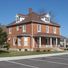 The school building features a two-story brick construction with specific architectural elements including a hip roof and front veranda with wooden columns.