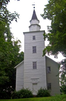 The white two-story clapboard church features a four-story tower with belfry, spire, and classically detailed doorway with sidelights on the east side.