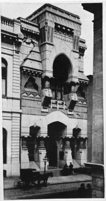 The building's interior displayed multicolored Minton tiles covering walls and floors, while iron trusses supported expansive skylights in the main room.