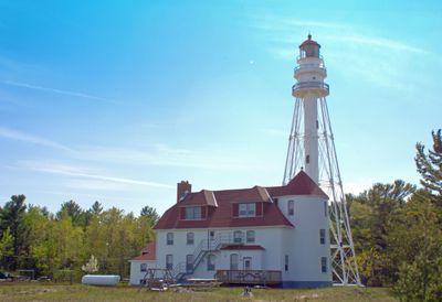 Rawley Point Light is a lighthouse on the shore of Lake Michigan with a steel skeletal framework. The structure uses a large glass lens system that projects light across the water to guide passing ships.
