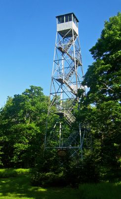 The Red Hill Fire Observation Station stands 60 feet tall at an elevation of 2,980 feet, offering extended views across the Catskill Mountains region.
