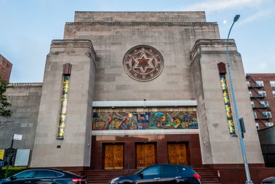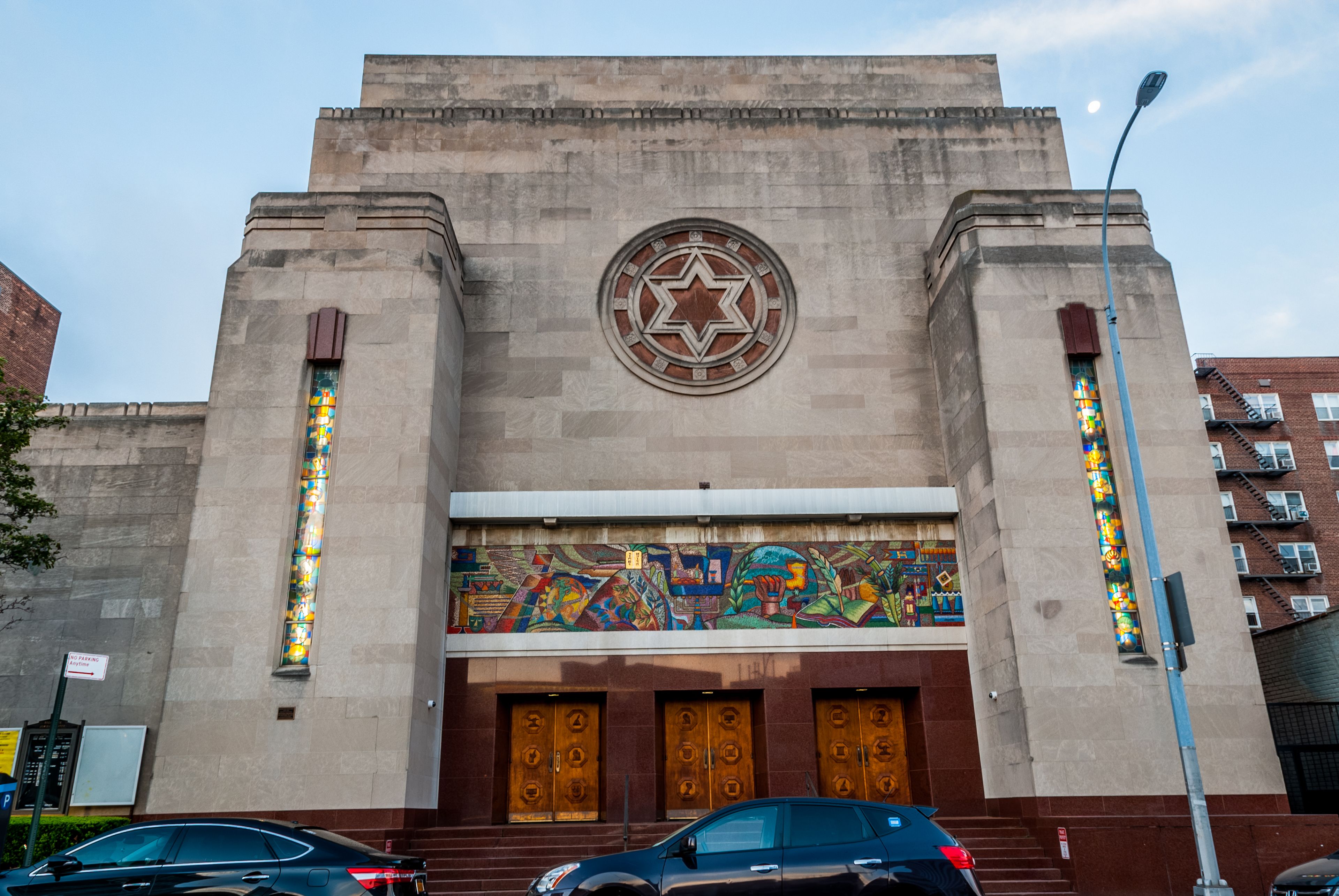 The Rego Park Jewish Center features an Art Deco Streamline Moderne style with a colorful mosaic facade created by artist A. Raymond Katz.