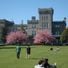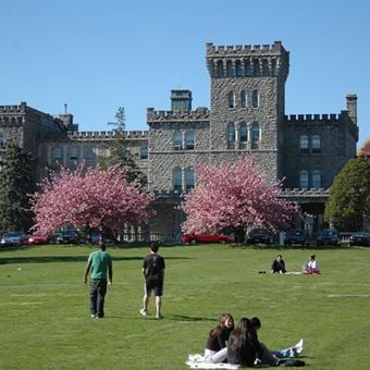 Reid Hall features collegiate Gothic architectural elements with stone walls, large windows, and decorative details throughout its multi-story structure.