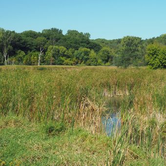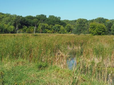 Reservoir Woods Park extends across 115 acres of hilly terrain with pine trees, wetlands, prairie grass, and savanna environments at different elevations.