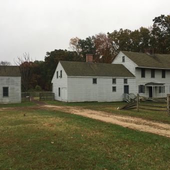 The house displays colonial design elements through its balanced front, multiple hearths, and wooden interiors that visitors can observe throughout the rooms.