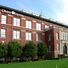 The building maintains its original exterior decorative elements, including detailed masonry work and prominent corner towers characteristic of Romanesque design.